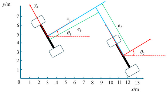 The world coordinate system, as depicted in Figure 4, is established. Assuming the car’s position at is , the coordinates of the rotation center for the car’s motion can be computed based on the car’s motion equation.