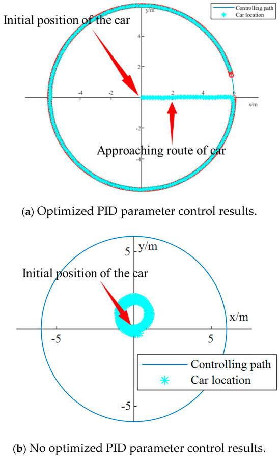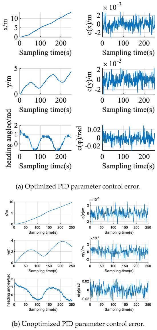 After the completion of the program setting, the first group uses the optimized PID parameters to control the trajectory of the car. The second group uses the unoptimized PID parameters to control the trajectory of the car. The control results are shown in Figure 13. The control error is shown in Figure 14 and Table 2. Among them, because the second set of numerical simulations fails to follow the preset trajectory, the error is no longer calculated.