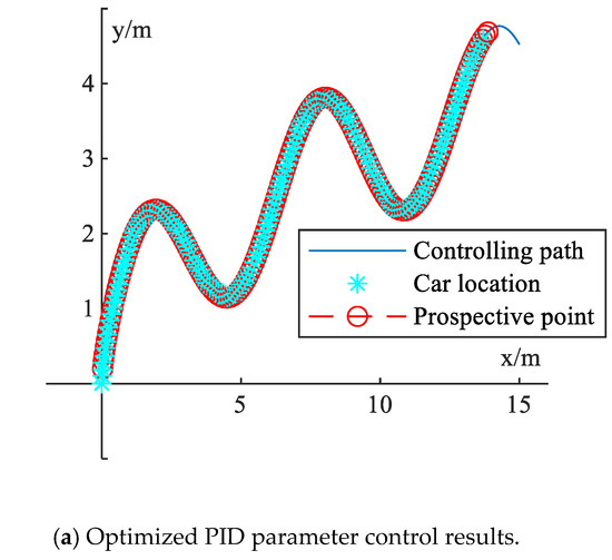 From Figure 13a, it can be seen that the car starts from the initial position under the action of the control system, quickly draws the distance from the control route through the approximation route, and then follows the control route. According to the specific analysis of the car’s driving process, it can be seen that at the initial stage of the car’s start-up, it simply drives the car forward and does not control the heading, so the approaching route is inclined; after the car enters the control route, the controller begins to implement heading control and speed control for the target point. At this time, the car’s trajectory coincides with the height of the control route.