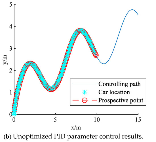 It can be seen from Figure 15b that the controller with the unoptimized PID parameters can also control the car to travel along the function curve, but it cannot walk smoothly at the same time. Because the initial position of the car is on the function trajectory, it avoids the process of the car approaching the preset trajectory in the circular trajectory, so that the car can drive according to the preset trajectory. By observing Figure 16b, it can be seen that the number of car-heading angle adjustments in the second group of the numerical simulations is significantly more than that in the first group. The analysis shows that because the unoptimized PID cannot control the wheel speed at the ideal value, the steering radian of the car is too large or too small during each steering motion. Therefore, it is necessary to continuously adjust the heading angle of the car, so that the car cannot walk smoothly at the same time.
