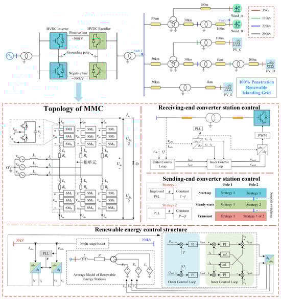 However, the operational challenge of a 100% renewable energy-integrated grid lies in its diverse operating conditions. Due to the zero-inertia nature of renewable energy sources, when a disturbance occurs in either the renewable generation or the system itself, the dynamic characteristics may necessitate that the VSC-HVDC system operates in multiple modes to ensure the overall stability of the power system. In a 100% renewable energy-integrated grid using a VSC-HVDC structure, the transmission power is entirely determined by the renewable energy stations []. As a result, renewable energy stations are typically controlled using constant active/reactive power control. The direct current (DC) voltage is maintained at a stable level at the receiving-end converter station, which uses a DC constant voltage/reactive power control strategy. Additionally, ensuring a stable AC voltage supply is critical for the grid connection and stable operation of renewable energy stations. Therefore, the sending-end converter station typically employs phase-locked loop (PSL)-based constant AC voltage and frequency control (constant V-f control) to maintain stable AC voltage and frequency [,,]. However, in a VSC-HVDC system with a bipolar configuration [], applying constant V-f control to both poles may result in both converter units regulating the same target, leading to system instability []. To address this issue, two potential solutions have been proposed: (1) joint V-f control [] and (2) constant V-f and constant P-Q control [] (using constant V-f control for one pole and constant P-Q control for the other). These control strategies effectively mitigate the stability issues caused by bipolar constant V-f control, but they do not fully meet the operational requirements of a 100% renewable energy-integrated grid under all conditions. The challenge of ensuring the constant and stable operation of such a grid across varying operational conditions has not been sufficiently addressed.