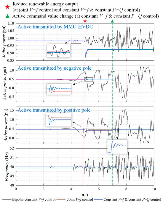 (2) When bipolar joint V-f control is used, the active power transmitted by the two poles remains equal. To further verify its stability, t = 5 s, setting the renewable energy output from 1 pu to 0.94 pu. The two poles can quickly adjust the transmitted power to achieve a reasonable power distribution. At the same time, the system frequency quickly returns to stability after small fluctuations. However, this control strategy means, in principle, that the two poles cannot be controlled independently, significantly reducing the flexibility of the system. This strategy was not investigated further.