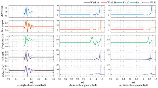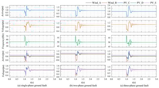 Similarly, when t = 1 s, single-phase, two-phase, and three-phase ground faults are set on the AC side of the sending-end converter station. The fault duration is 0.1 s. Like Figure 6, Figure 7 shows the electrical quantity waveforms during the fault. When a single-phase ground fault occurs, the AC side voltage of the sending-end converter station drops to a minimum of 0.7 pu, leading to a sharp drop in the PCC voltage of each renewable energy station, reaching 0.6 pu during the grid fault period. Similar to the ground fault at the PCC of the renewable energy station, after the fault is cleared in each case, the active power, voltage, and frequency are restored to pre-fault values quickly, and the system is restored to stable operating conditions. During the fault period, the renewable energy output fluctuates greatly, causing the system frequency to fluctuate greatly as well. When a two-phase or three-phase ground fault occurs, the AC side voltage of the sending-end converter station plummets to 0, and the PCC voltage of the renewable energy station drops to 0 pu. Without AC voltage support, the renewable energy site goes off-grid, leading to system collapse.