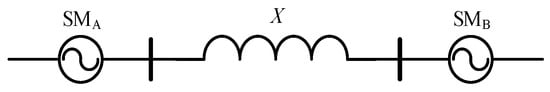 This section discusses the principle of power synchronization by employing a simple system comprising two interconnected synchronous motors (SMs). As depicted in Figure 8, SMA runs as a generator, and SMB runs in the motor state. Assuming negligible resistance, the total reactance of the line and the two SMs is X. In steady-state operations, the electromotive forces of the two SMs are denoted by and , respectively. Then, the line-transmitted active power can be expressed as