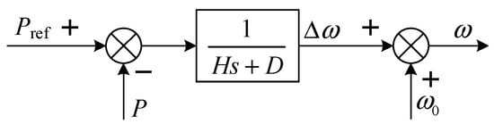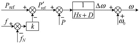 Under conventional PSL, when P = Pref, the PSL synchronizes with the grid and maintains the renewable energy-integrating grid frequency at the rated value, fN. However, if the renewable energy output fluctuates—for example, with a reduced output—at this point, P < Pref and . Since the renewable energy output cannot be flexibly controlled, it is impossible to reduce the power deviation through power transfer. This power deviation will persist until the renewable energy output returns to its rated value when the renewable energy-integrating grid operates at a higher frequency rating. To maintain the frequency and synchronize with the grid during the renewable energy power fluctuation, an improved power-synchronization control is constructed by adjusting Pref in real-time according to the system frequency deviation, as shown in Figure 10, where the adjusted active power command value during the renewable energy power fluctuation. During the renewable energy power fluctuation, the frequency deviation value is converted into power deviation and appended to the active power command value so that the renewable energy output, , during the fluctuation period is equal to the adjusted active command value , ensuring the stable operation of the islanded grid at the rated frequency.