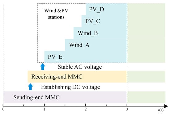 This 100% renewable energy-integrating grid does not have any synchronous power source; hence, its start-up and grid connection require a sending-end converter station to establish stable AC voltage. Based on the analysis in Section 2.3, the bipolar constant V-f control is used during the start-up process. Figure 11 shows a start-up sequence diagram.