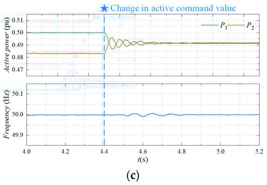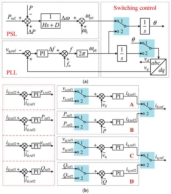 Meanwhile, a smooth switching control block diagram of the outer control loop is constructed, as shown in Figure 12b []. Modules A and C are outer loop control circuits with constant V-f control, and modules B and D are outer loop control circuits with constant P-Q control. During system start-up, the toggle switch is in position 1, at which time id,ref is connected to module A, and iq,ref is connected to module C. The converter is controlled by constant V-f. When system start-up is complete, the switch position is switched from 1 to 2 so that id,ref and iq,ref are connected to modules B and D, respectively, thus switching to constant P-Q control. The red dotted box is the current command value synchronization module, which synchronizes the dq current command values output by the two control strategies so that id,ref1 = id,ref2 and iq,ref1 = iq,ref2 at all times. This ensures that id,ref and iq,ref remain unchanged at the moment of switching to achieve the smooth switching of the outer loop output’s dq current command value.