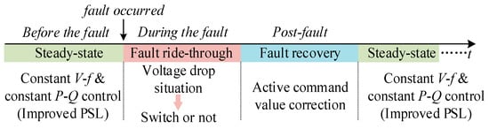 - Before the fault: The system is in a steady-state operation, and the sending-end converter station adopts constant V-f and constant P-Q control. An improved PSL ensures the synchronous operation of the system.