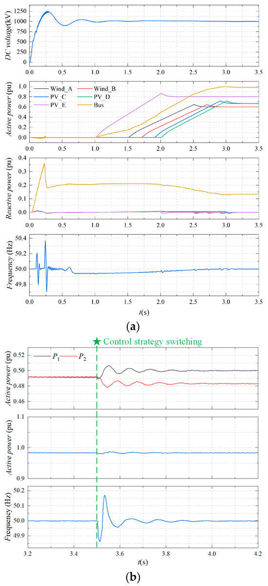Figure 14b shows that after the control strategy switch, when the constant P-Q pole is dominant, each pole adjusts its transmitted active power and reaches a steady state at t = 4 s, when the constant P-Q pole transmits 0.5 pu of active power and the constant V-f pole transmits 0.484 pu of active power. To ensure the symmetrical operation of the two poles of the sending-end converter station at t = 4.5 s, the constant P-Q pole active power command value is corrected according to the total transmitted active power of the sending-end converter station. When t = 5 s, the system restores stability, and the transmitted active power of both poles is 0.492 pu. This simulation analysis shows that the control scheme proposed in this study can achieve smooth start-up and steady-state operations in a 100% renewable energy-integrating grid via VSC-HVDC.