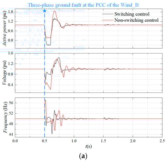 The simulation results for the AC side voltage, power, and frequency when a three-phase ground fault occurs at the PCC of Wind_B are shown in Figure 15a. While the switching control strategy helps support the AC voltage, it does not effectively suppress fluctuations in active power and frequency compared with the non-switching scenario. Moreover, the switching of the control strategy after the fault introduces secondary oscillations in the electrical quantities, which is detrimental to the stable operation of the system.