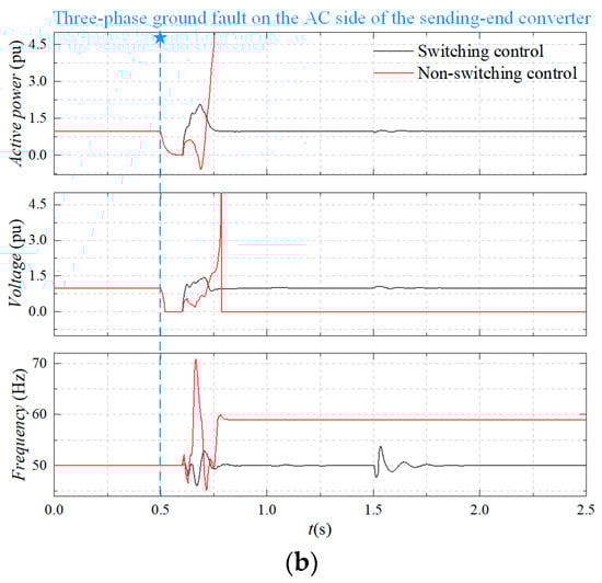Figure 15b shows the simulation results when a three-phase ground fault occurs on the AC side of the sending-end converter station. With non-switching control, the system experiences a significant voltage drop and eventually collapses. In this case, a bipolar constant V-f control strategy is required to provide the necessary AC voltage support and prevent system collapse. However, with switching control, the system successfully rides through the fault and eventually regains stability.