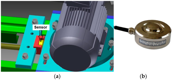 Figure 2a shows the specific installation of the EMSYST sensor and its location within the assembly. Figure 2b shows a photo of the Emsyst EMS50-100 kN sensor in use. Before the experiments were carried out, the sensor was calibrated after being mounted in the assembly using the calibration parameters supplied by the manufacturer Emsyst, exactly according to the sensor serial number. Since the sensor is not located in the plane of the belt, it is necessary to count on the necessary calculation of the exact value of the belt tension, which can be compared with the actual value of the belt tension. The actual value of the belt was measured by the aforementioned non-contact method using the SKF measuring device.