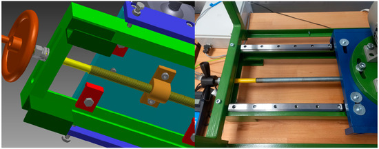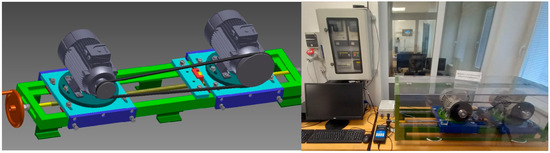 The tensioning of the belt from the belt transmission is carried out using a threaded rod, which is located on the bottom of the device (Figure 3). By turning the crank, one of the electric motors is moved, which tightens the belt to the desired value. This equipment is designed to allow new types of belts to be tested while changing pulleys and belts is very easy. Testing belts in extreme conditions can be achieved through simple adjustments to the desired belt setting. In this way, we can adjust the pulleys to have a certain angular and axial misalignment, ensuring accurate testing under extreme conditions.