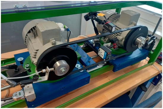 Belt drive equipment is often subject to vibrations that result in an undesirable phenomenon known as belt “floating” [28]. It is necessary to study this phenomenon in detail because it can have a negative effect on the life of the entire system and lead to premature wear of its components, especially the bearing of the shafts. On the newly designed test equipment, it is possible to change the belt tension in a controlled manner by adjusting the axial distance between the pulleys. This function makes it possible to analyze the behavior of vibrations in different places of the system and under different operating conditions.