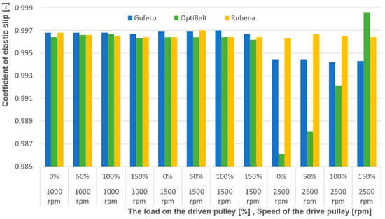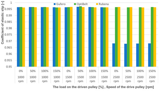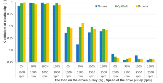 Experimental measurements showed that the highest values of the belt elastic slip coefficient were at the lowest set speeds, but when the speeds were increased, the tension was increased, and these values reached an optimal state. The monitoring of the belt slip was carried out on the loaded and unloaded belt branch, with higher slip values measured on the unloaded branch, which has a more significant impact on the overall vibrations of the entire system. From the perspective of belt life, the values on the loaded branch were more significant, and the measurements showed that the belt tension and speed have a significant impact on this parameter. The range of medium values of the set tension and speed parameters can be considered optimal. From these findings, it can be deduced that tensioning above a certain level no longer brings benefits in the form of reducing slip but can have a negative impact on the life of the belt or other components, such as bearings. From the perspective of vibration, increasing the speed logically has the highest impact, while the belt tension has only a minimal impact on the measured values. To eliminate vibrations, it would be appropriate to incorporate damping elements into the assembly so that they do not negatively affect other drive elements.