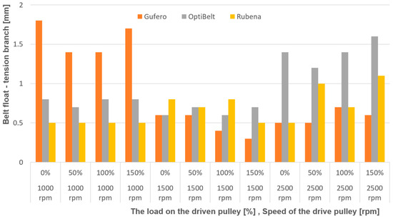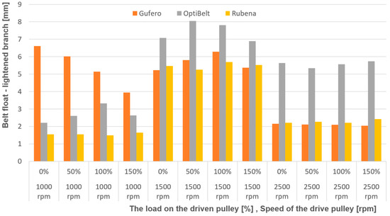 Figure 9 shows the results of experiments that show the dependence of the belt float in the lightened branch at optimal tension and different conditions. As part of the experiment, the input speed of the drive pulley and the output load were varied [27]. Tests were performed with three A-type V-belts from different manufacturers. As can be seen from the results, the differences in the belt float are clearly visible, both depending on the load change and when the belt manufacturer was changed, indicating the influence of material quality and processing on the operational behavior of the belt.