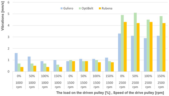 Figure 11 shows the small differences in vibration when using an “A” belt from different manufacturers. At higher speeds, which in the experiment reached a value of up to 2500 revolutions per minute (rpm), these differences become more pronounced. At lower speeds, namely 1000 and 1500 rpm, the differences in vibrations were less significant. This fact indicates that higher revolutions lead to an increase in vibration, and the differences between belts from different manufacturers are manifested primarily under these conditions [29].