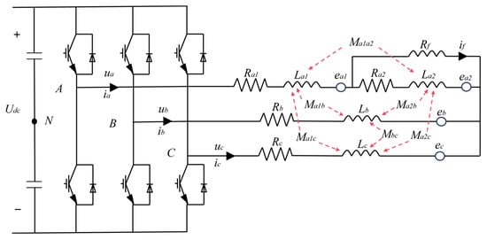 where Uf,abc is the stator voltage matrix, Rf,abc is the stator resistance matrix, If,abc is the stator current matrix, Lsf is the stator inductance matrix, U0 is the neutral voltage, and Rs is the stator resistance and is equal to the three-phase stator winding.