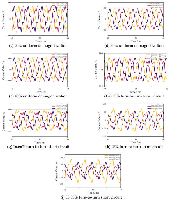 It can be seen that when the turn-to-turn short-circuit fault occurs in phase A, the short-circuit turns ratio will affect the fault current and thus the phase A stator current, resulting in a three-phase current imbalance, and the turn-to-turn short-circuit fault will cause peak current fluctuations between the phase and the phase.