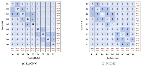 The noise reduction processed data are used as the input of the diagnostic network model for network training and testing in order to verify the effectiveness of this paper’s use of the Gray Wolf algorithm to optimize the variational modal decomposition parameters for fault diagnosis. It is compared with the CNN-BiLSTM without preprocessing in order to further validate the effectiveness of the proposed method. We propose in this paper’s method along with Residual Convolutional Neural Networks (ResCNN) the Multi-scale Convolutional Neural Networks (MsCNN) and other methods for comparison. One of the residual blocks in ResCNN consists of multiple convolutions and is the core part of ResCNN. A residual block contains two paths: one is the regular convolutional layer path and the other is a jump connection that passes the input signal directly to the output, avoiding the attenuation of the gradient when it passes through multiple convolutional layers and making it easier to learn the constant mapping. The core of MsCNN is that it contains multiple convolutional kernels of different scales. In a traditional CNN, a fixed-size convolutional kernel is usually used to extract features, whereas MsCNN uses different sizes of convolutional kernels such as small, medium, and large at the same time. In data processing, a small convolutional kernel may be good at capturing details and local features in the data; a large convolutional kernel is capable of acquiring more macroscopic structural features as shown in Figure 9 for the same working conditions. Fault diagnosis results in a confusing map in different working conditions. Diagnostic results are shown in Figure 10. From the diagnostic results, it can be learned that the method used in this paper has a certain improvement in diagnostic accuracy compared to CNN-BiLSTM without data preprocessing, thus verifying that the preprocessed data in this paper are conducive to the subsequent fault diagnosis, and the comparison between CNN-BiLSTM and ResCNN and MsCNN can also be learned from the method’s superiority in diagnostic accuracy. The overall analysis reveals that the method proposed in this paper has improved the fault diagnosis accuracy of PMSM.