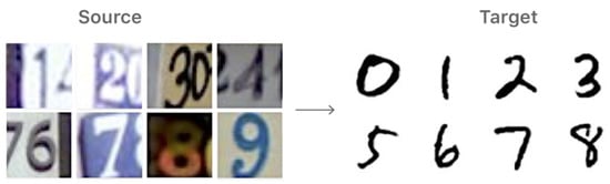 Domain adaptation for object detection has emerged as an important research area, particularly in industrial settings where domain shifts, such as varying environmental conditions, sensor types, and object scales, create significant challenges for machine learning models. One of the main challenges in industrial object detection is the domain shift problem, where models trained on one domain (e.g., synthetic datasets) perform poorly when transferred to another domain (e.g., real-world industrial settings). Annotated industrial datasets are often scarce, leading to poor generalization of models trained on general-purpose datasets like COCO [18,19]. Unsupervised domain adaptation (UDA) has been explored to address the domain shift issue. Domain-adversarial neural networks (DANNs) align feature representations across different domains, improving performance on unseen data [20]. Similarly, CycleGANs have been employed to generate synthetic images that mimic real-world industrial data, enhancing model generalization [21]. Despite these advancements, challenges such as occlusions, background clutter, and high computational cost remain unsolved [9,10]. Figure 1 shows domain adaptation on MNSIT data, which is two-dimensional. The diagram shows how it is easier for domain adaptation to be applied on 2D directly and does not need to take into account the local alignment of corners, three-dimensional shapes, and planes.