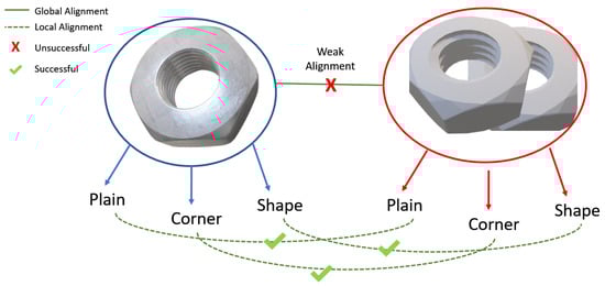 Industrial applications are increasingly leveraging 3D data, such as point clouds and voxel grids, which provide more detailed geometric information. This is particularly beneficial in tasks like robotic manipulation, where depth information is critical [22,23]. Algorithms such as PointNet and its successor, PointNet++, directly process point clouds, making them suitable for tasks requiring precise geometric understanding [24,25]. VoxelNet also integrates 3D CNNs to handle 3D object detection but faces computational challenges in real-time applications [26,27]. Figure 2 shows domain adaptation on a three-dimensional industrial dataset taking into account the plains, corners and overall shape of the tool.