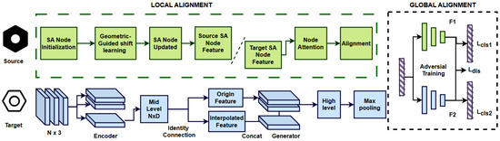 This operation minimizes the complexity of the local features but maintains the relevant details of the neighborhood that is most essential. The node attention mechanism allows for a selective focus on specific nodes of each local neighborhood. This weighting also ensures that unnecessary nodes do not contribute to the alignment in the first place. This mechanism helps the model to accentuate local contributing elements without interference from non-critical components. Following the node attention phase, there is an alignment of the source and target node features. This local alignment ensures the pointwise features from both domains are related to the same or nearly the same geometric structure. This is achieved with the help of a node-based adaptation strategy where features of local neighborhoods from the source domain are adapted to the related neighborhoods of the target domain.