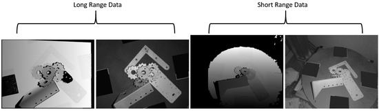 As shown in Table 3, the objects in MVTec ITODD vary significantly in terms of diameters, ranging from 2.4 cm (smallest, e.g., washers) to 26.7 cm (largest, e.g., punched rail), and are characterized by different levels of symmetry, complexity, and reflectivity. The objects are arranged in both single-instance scenes and cluttered, multi-instance configurations, simulating real-world industrial environments such as conveyor belts and bin-picking. Each scene is captured using both long-range, high-quality and short-range, low-quality 3D stereo sensors, as well as three high-resolution grayscale cameras. The difference between these sensor types is crucial for domain adaptation, particularly when adapting models trained on high-quality data (long-range) to lower-quality data (short-range), as illustrated in Figure 6 [6].