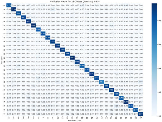 Figure 8 shows the confusion matrix for 28 classes with an average accuracy of 85%. The recall results in Figure 9 confirm that the model remains effective under conditions of partial occlusion and clutter, which are typical in real-world industrial settings. The node-based alignment strategy ensured that localized features in cluttered environments aligned correctly with corresponding target domains, improving robustness. Moreover, the adversarial global alignment layer, employing a Gradient Reversal Layer (GRL), further enhanced the model’s ability to generalize across varied datasets, contributing to its resilience. The loss graphs in Figure 7b,d indicate smooth convergence during training, with minimal overfitting. The use of a combination of classification, adversarial, and node adaptation losses allowed the model to align features across domains effectively while maintaining high classification performance. This multi-faceted loss optimization demonstrates that the proposed architecture can efficiently manage trade-offs between performance on source and target domains.