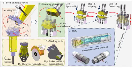 To address this issue, automatic hydraulic quick coupling devices (AHQCDs) have been designed and attempted to be installed on rescue vehicles, enabling quick tool changes within minutes and allowing a single vehicle to perform multiple tasks [3,4]. During the tool-changing process, the hydraulic lines must be docked with the mechanical frame simultaneously, presenting a technical challenge that has been extensively studied. Liebherr and Oilquick have developed automatic hydraulic quick coupling systems (AHQCSs), including the Likufix and OQ series, respectively [5,6,7]. Specialized hydraulic quick couplings (HQCs) have been used to simultaneously dock hydraulic lines during tool changes, with an average time of 60 s [8]. The K100 boom change system has been developed by Komatsu for replacing booms while simultaneously connecting the hydraulic lines in high-reach demolition machines [9]. Yun Chao [10,11] provided a comprehensive review of specialized HQCs, examining their applicability in hydraulic quick coupling systems. He proposed a solution for automatic docking of HQCs that balances cost and manufacturing complexity.