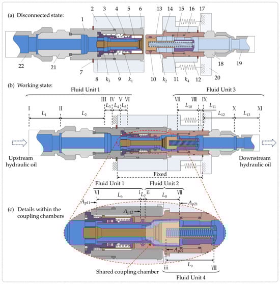 As shown in Figure 2, each fluid unit has a relatively complex geometrical feature. To enhance the calculation accuracy of the fluid equivalent stiffness, Fluid Unit 1 is segmented into six parts, while Fluid Unit 2 is divided into four parts based on the structural shape. L1 and L13 represent the upstream and downstream connecting hydraulic lines of the HQCs, respectively. The volumes of the four fluid units are V1, V2, V3, and V4, respectively, as indicated in Equations (7)–(10). The dimensional parameters of each segment of the fluid units are presented in Table 1, while the cross-sectional area parameters of the two poppets are detailed in Table 2.