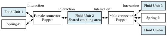 As shown in Figure 2, the HQCs have a very compact configuration with a complex and narrow valve channel. In the working state, as hydraulic fluid flows through this narrow channel, and the internal poppets are accelerated due to pressure pulsations resulting from the strong geometric constraints. This vibration of poppets, in turn, affects the pressure distribution within the flow field, further intensifying the vibration of the poppets. Therefore, fluid–structure interaction between the poppets and the fluid must be considered. Moreover, the fluid–structure interaction at the interface involves the fluid unit, which includes the upstream lines, the shared coupling area, downstream lines, as well as the solid unit, which consists of the two poppets. The influence of the fluid unit on the system’s dynamics primarily involves inertia and compressibility, while the influence of poppets on dynamics includes their inertia and the stiffness of the mechanical spring. The interaction between these units within the coupling system is illustrated in Figure 3.