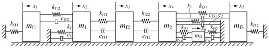 Building on the aforementioned analysis and assumptions, the dynamic model of the HQCs with connecting hoses is developed, as shown in Figure 4. In this model, m1 and m2 are the masses of the female and male poppets, respectively. k1 and k2 denote the mechanical stiffnesses of the springs associated with the female and male poppets, respectively. c1 and c2 denote the mechanical damping between the poppets and the valve seats. Here, mfi (where i ∈ {1,2,3,4}) represents the mass of each fluid unit, while kf1i, kf2i, kf3i, and kf4i (where i ∈ {1,2}) represent the equivalent stiffness of each fluid unit at a contact boundary with the solid unit, respectively. cf1i, cf2i, cf3i, and cf4i (where i ∈ {1,2}) represent the damping characteristics of each fluid unit. xi (where i ∈ {1,2,3,4,5,6}) denotes the displacement of the equivalent mass blocks of the fluid and solid units.