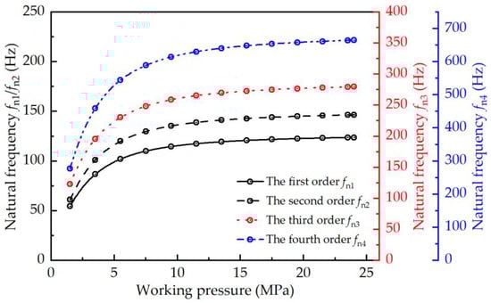 Based on the Nykanen model of bulk modulus of elasticity presented in [32], Ev is fundamentally influenced by the pressure and air content for a specified fluid. Therefore, keeping the air content of the oil constant, the effect of working pressure on the first four natural frequencies of the docking system is illustrated in Figure 6.