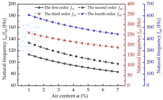 In rescue scenarios, rescue vehicles frequently switch between hydraulic tools, leading to the repeated disconnection and reconnection of HQCs, as illustrated in Figure 2. This process inevitably introduces a certain amount of air into the hydraulic system. Keeping the working pressure unchanged, the effect of the air content on the first four natural frequencies of the system is obtained, as shown in Figure 7.