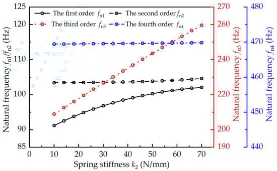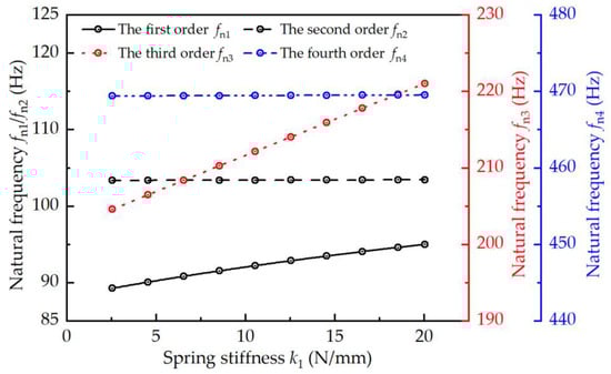 Variation curves of the first four natural frequencies with different stiffnesses of male springs.
