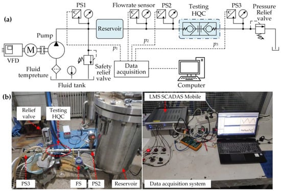 To validate the accuracy of the modal analysis of the docking system, a platform for testing the HQCs with connecting lines was constructed. A schematic of the platform is shown in Figure 10a, while Figure 10b shows a picture of the hydraulic test platform. A three-plunger pump, driven by an electric motor, is used to provide a constant flow of 60 L/min. A pressure relief valve is used to regulate the pressure of the hydraulic system in the range of 2 to 6 MPa. Pressure sensors PS1, PS2, and PS3 are installed to measure the pressure at the pump outlet, upstream line pressure, and output pressure of the testing HQCs, respectively. A reservoir is mounted on the test platform to reduce pressure pulsation and mechanical vibration from the pump, thereby facilitating the measurement of small-amplitude resonance characteristics. It should be noted that, due to constraints of leakage and environmental protection during the docking process, pure water is used as the working fluid in the experiment. The primary differences in physical parameters between pure water and hydraulic oil are presented in Table 6, and all other parameters in the test are set to be identical to those shown in Table 4.