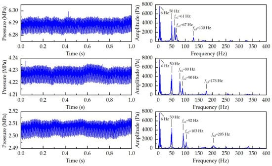 The fast Fourier transform was applied to analyze the pressure signal output p3 from the test system in both the time and frequency domains. The amplitude–frequency curves of the pressure signal of the docking system, influenced by fluid self-pulsation excitation, are shown in Figure 11.