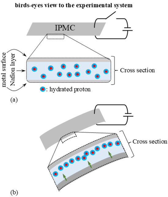 A conventional bending mechanism and the state of mobile protons. (a) IPMC under zero electric stimulation. (b) Bending induction due to the transversal movement of hydrated protons, which is caused by the electric field, toward the negative electrode side of the IPMC. Green arrows indicate the direction of the movement of hydrated protons.