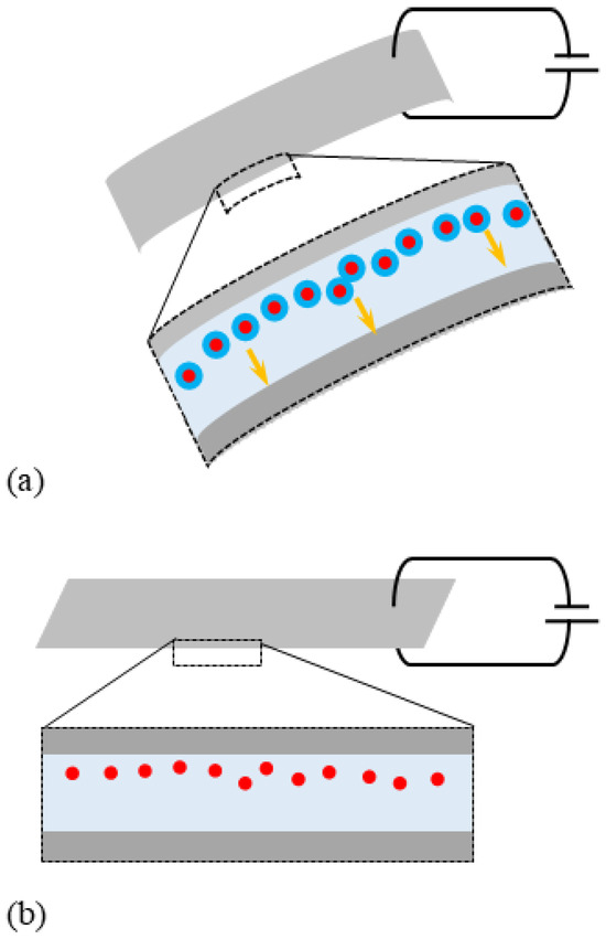 When platinum-coated Nafion IPMC is exposed to electric stimulation from a power supply, the hydrated protons are drawn toward the electrode connected to the power supply’s negative terminal. This creates a volume gradient across the transverse direction of the IPMC, resulting in bending, as illustrated in Figure 1. This describes the conventional bending mechanism of IPMC [32].