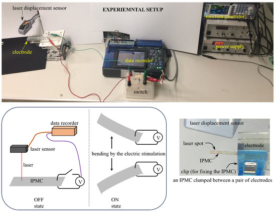 Bending tests were conducted using the setup shown in Figure 3. A horizontally clamped IPMC was subjected to external electric stimulation, and the induced bending (the vertical displacement of the IPMC tip) was measured using a laser displacement sensor. Data from the laser displacement sensor were recorded over time using a data recorder, shown in Figure 3, along with simultaneous measurements of voltage and current.