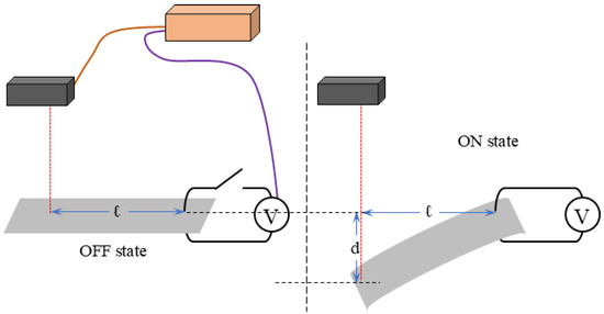 A constant voltage of 2 V was applied to the IPMC, and its displacement (denoted as d) was measured using a laser displacement sensor. The measured displacement was later converted into the bending curvature [34]. The data of the IPMC’s vertical displacement, d, were converted into curvature using Equation (1); see the definitions of d and ℓ in Figure 4.