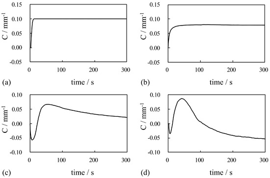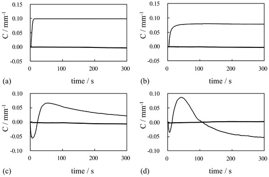 Quite intriguingly, Figure 5 and Figure 6 suggest that the bending motion of Ag-CMV and Ag-CMVN was induced only when the current was non-zero. On the other hand, Ag-AMV and Ag-AMVN continued to exhibit bending even though the induced current was zero. Therefore, the bending controllability of Ag-CMV and Ag-CMVN through current control must be practically utilizable, while the bending controllability of Ag-AMV and Ag-AMVN is unlikely to be useful. Using Equation (2), it was possible to numerically calculate the total charge as a function of time, denoted as Q(t), for all four IPMCs. We then investigated the “Curvature vs. Charge” relationship for these four IPMCs. The results are shown in Figure 7. There is a well-ordered relationship between the curvature (C) and charge (Q) for Ag-CMV and Ag-CMVN; namely, the constant increase in Q led to an increase in C. On the other hand, the curvature of both Ag-AMV and Ag-AMVN decreased, then increased, and then decreased again as Q increased, as clearly seen in Figure 7c,d. Therefore, it is unlikely that the curvature of Ag-AMV and Ag-AMVN can be controlled through charge (or current) control.