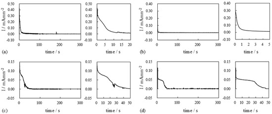 Current vs. time (diagrams for 0 ≤ t ≤ 300 and for the early stage) when the experiments to obtain the diagrams shown in Figure 5 were conducted. The current represents the current for a unit surface area of the IPMCs. (a) Ag-CMV; (b) Ag-CMVN; (c) Ag-AMV; (d) Ag-AMVN.