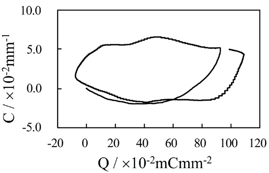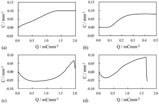 For comparison, we present the “Curvature vs. Charge” plot for Ag-AMV in Figure 14, with data obtained from the experiment for Figure 10c. This plot shows that the relationship between the curvature and charge for Ag-AMV deviated significantly from a linear pattern. The same was true for Ag-AMVN (though the diagram is not shown here). Neither Ag-AMV nor Ag-AMVN exhibited a linear or near-linear relationship between their curvature and charge.