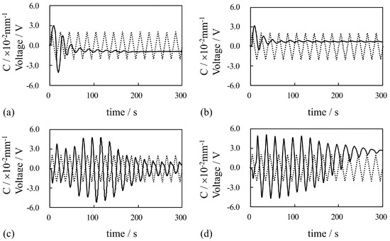 Curvature vs. time (solid curve) under an alternating voltage (dotted curve) with an amplitude of 2 V and a frequency of 0.005 Hz. (a) Ag-CMV; (b) Ag-CMVN; (c) Ag-AMV; (d) Ag-AMVN.