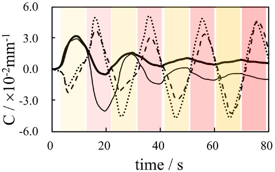 On the other hand, all four IPMCs exhibited positive bending curvatures around t = 50 s, as suggested in Figure 5. Hence, all four IPMCs were expected to bend in the same direction under an alternating voltage with a low frequency, such as a 200 s (50 s × 4) period (frequency = 0.005 Hz). Figure 10 shows the time dependence of the bending curvatures of Ag-CMV, Ag-AMV, Ag-CMVN, and Ag-AMVN when the alternating applied voltage frequency was quite low, at 0.005 Hz. As expected, all the IPMCs exhibited very similar bending characteristics. For example, all the IPMCs exhibited positive bending curvatures at around t = 100 s and negative curvatures at around t = 200 s. Therefore, regardless of the sign of immobile charges contained in the IPMCs, all of them bent in the same direction according to the polarity of the applied voltage. The experimental data curves of “Curvature vs. Time” shown in Figure 10 are consolidated into a single diagram in Figure 11. This clearly suggests that all four IPMCs bended in the same direction.