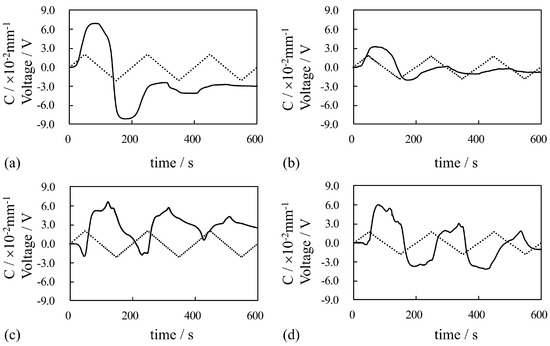 An alternating voltage with an amplitude of 2 V was applied to the IPMC at frequencies of 0.05 Hz and 0.005 Hz. The resulting IPMC bending displacement was measured using a laser displacement sensor, and the measured displacement was later converted into curvature, as performed in the experiment described in Section 3.1.