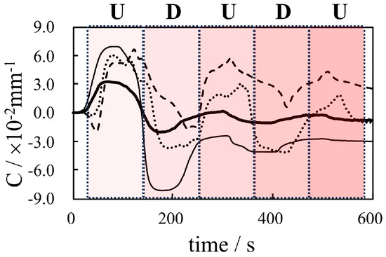 Curvature vs. time, as shown in Figure 10. U: upward bending; D: downward bending; thin curve: Ag-CMV thick curve: Ag-CMVN; dotted curve: Ag-AMVN; dashed curve: Ag-AMVN.