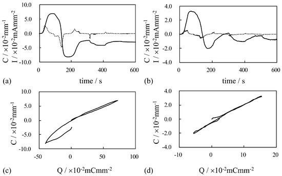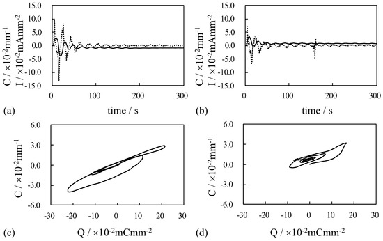 Current (dotted line) and curvature (solid line) vs. time. (a) Ag-CMV; (b) Ag-CMVN, curvature vs. charge; (c) Ag-CMV; (d) Ag-CMVN.